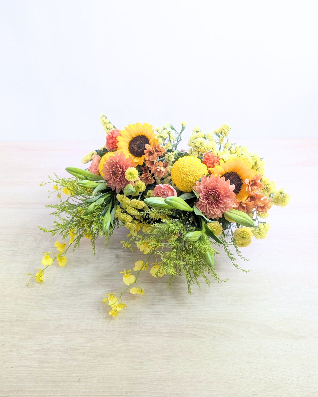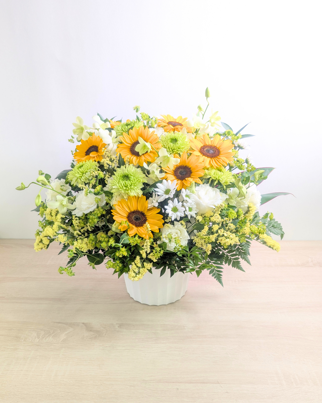 バラやかすみ草は入れず、ひまわりを入れて黄色や緑の色合いにしてほしいという