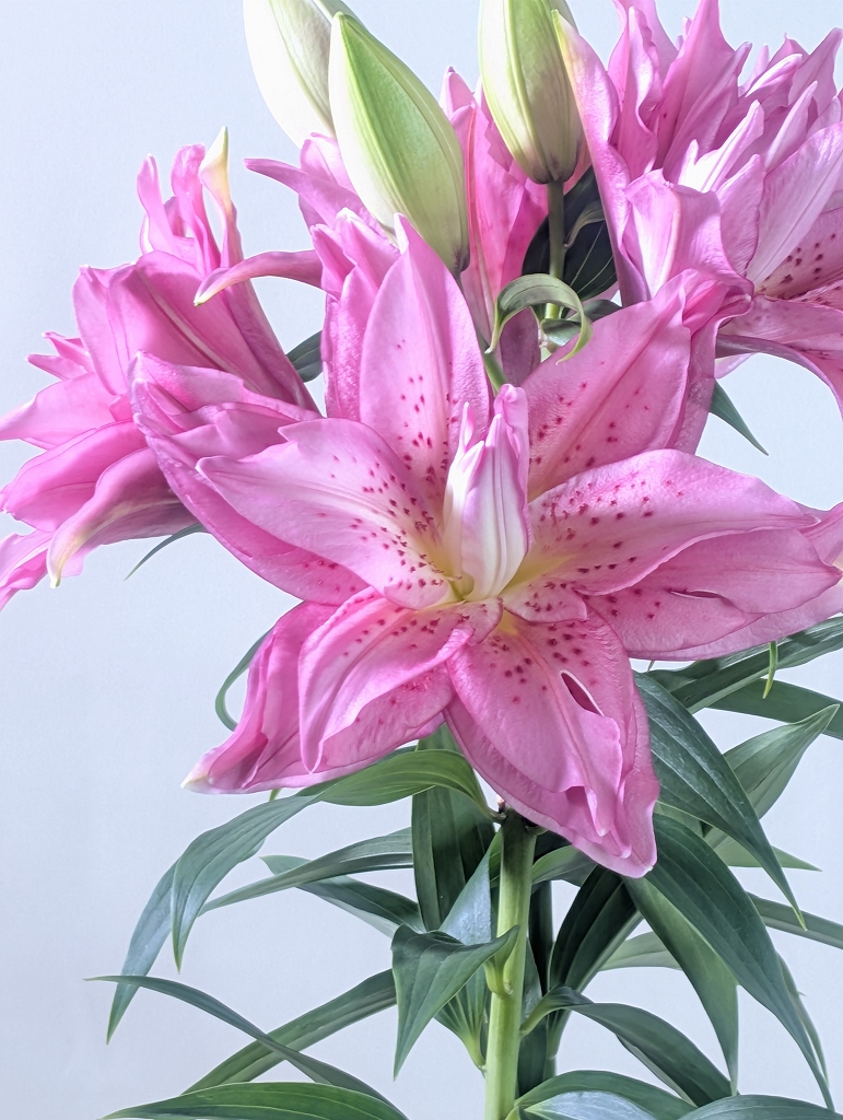 ピンクや白のバラやユリ、カスミソウを合わせたアレンジメントが人気。新しい門出を清らかに彩ります。