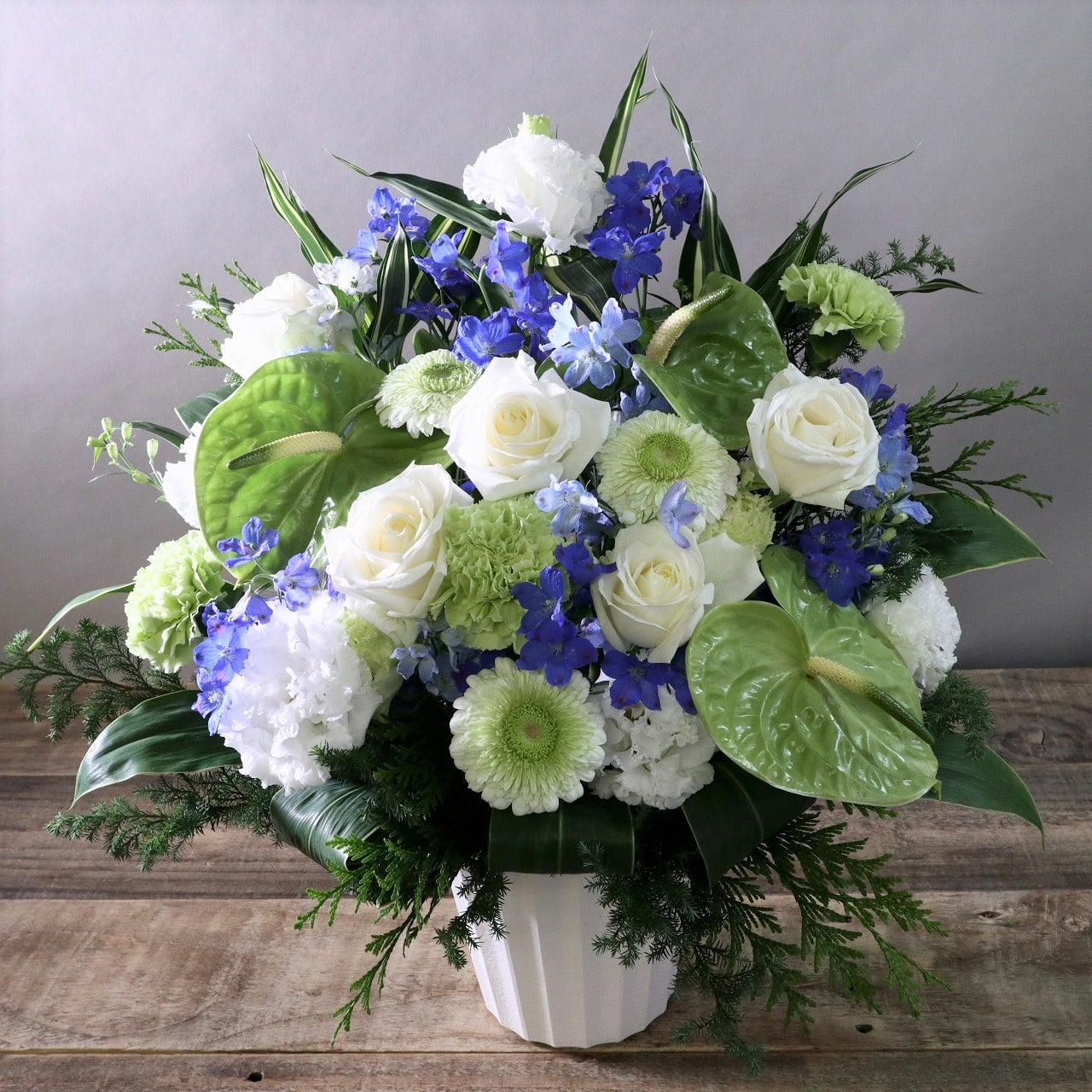 白い花の中に、とても素敵なアクセントになる青の花を散りばめて頂いて、スタイリッシュで華やかな物になりました。