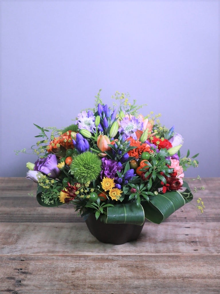 ご感想:母は派手な花より、ひっそりと咲く地味目な花が好きとのこと、青系、紫系の花に黄色系や赤、オレンジ系の花を差し色に秋の山野を感じるアレンジメントをお願いします、とリクエストしました。以前からSNS等を通してこちらのデザインの雰囲気を気に入っていたので、どんな感じになるか楽しみでした。結果は写真の通りとても素敵なアレンジメントで、母はこんな素敵なアレンジメントは今までに見たことがない!と大変喜んでいます。アクセントに散りばめられた女郎花が特に気に入ったようです。あとHANAIMO さんのお花はとても長持ちするので、また次の機会にもお願いしたいと思います。ありがとうございました。