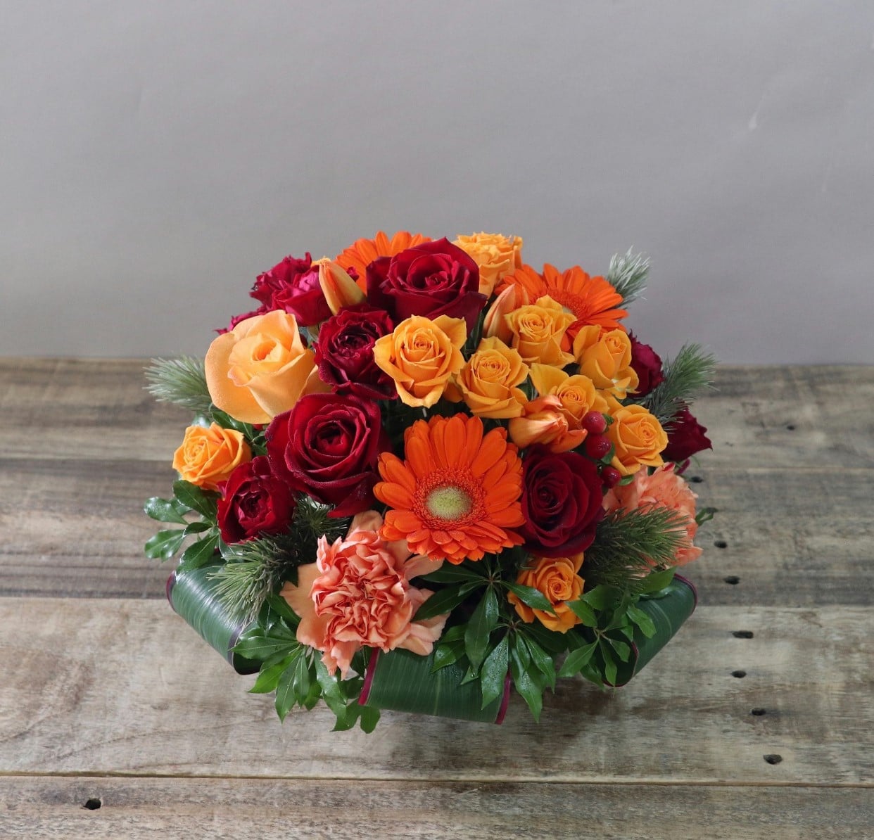 遠方に住んでいる伯母が訳あって気分が沈んでしまっているようだったので、伯母の好きなお花を送って少しでも気分が明るくなってもらいたいと思い、ネット配送を探していたらHANAIMOさんのHPを見つけました。伯母からの赤い花がいいというリクエストがあったので、色で選べるお店を探していたので、コレだと思いました。伯母のイメージカラーのオレンジも混ぜた赤オレンジ系にしてもらい、仰々しすぎず邪魔にならない小さいサイズにしてもらいました。