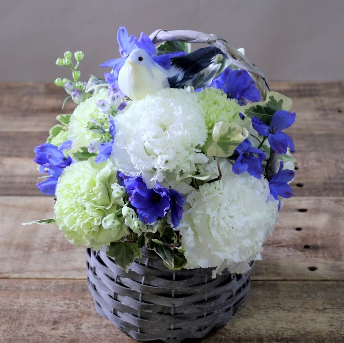 ご感想:故人のお母様の好きなブルーと可愛いブルーバードで愛らしく爽やかで大好きなアレンジです。有難うございました。