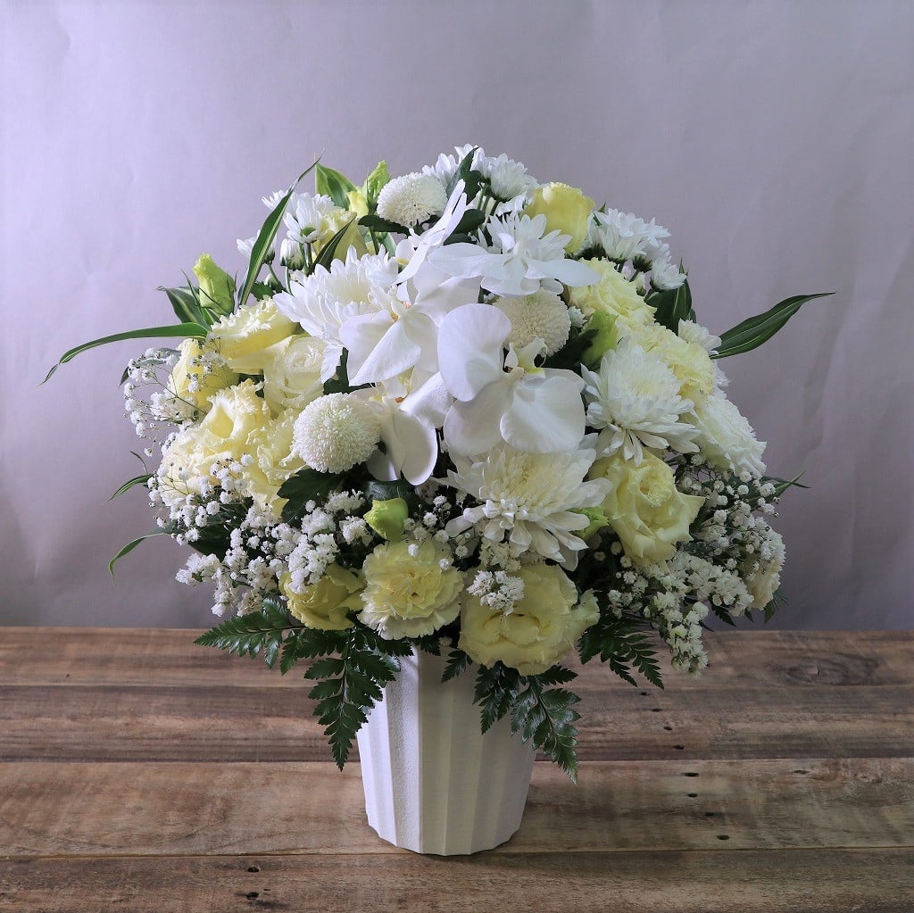 ご感想:まず、お電話にて問い合わせをいたしましたが、その際の対応が素晴らしかったです。アレンジの内容のご説明も丁寧で、さらにこちらの要望を十分聞いてくださいました。送っていただいた画像のお花は、お願いした通りの穏やかなトーンのクリームが入っていて大変上品なアレンジでした。大満足です。先方からも、素敵なお花だと喜んでもらえました。ありがとうございました。