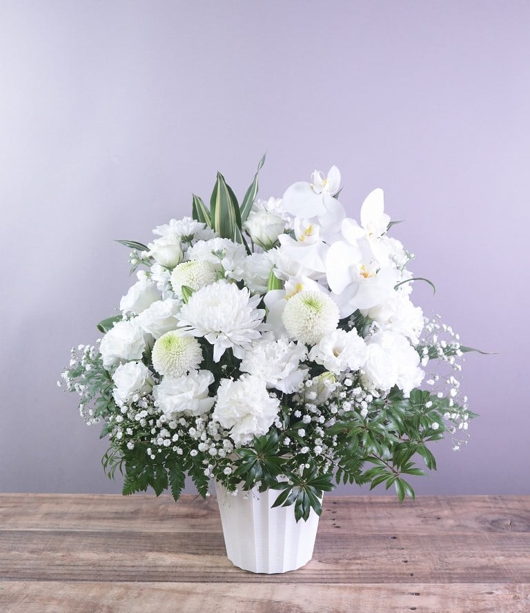 注文商品名:【レビュー好評◎花画像サービス付】急な訃報におくるアレンジメント「ブラン」(Mサイズ)