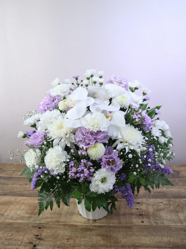 ご感想:11000円の「ふじいろ」と「インディゴ」でこんな感じでと注文をお願いしましたが想像通りで、他のお花と比べても見劣りしない素敵なお花でした。