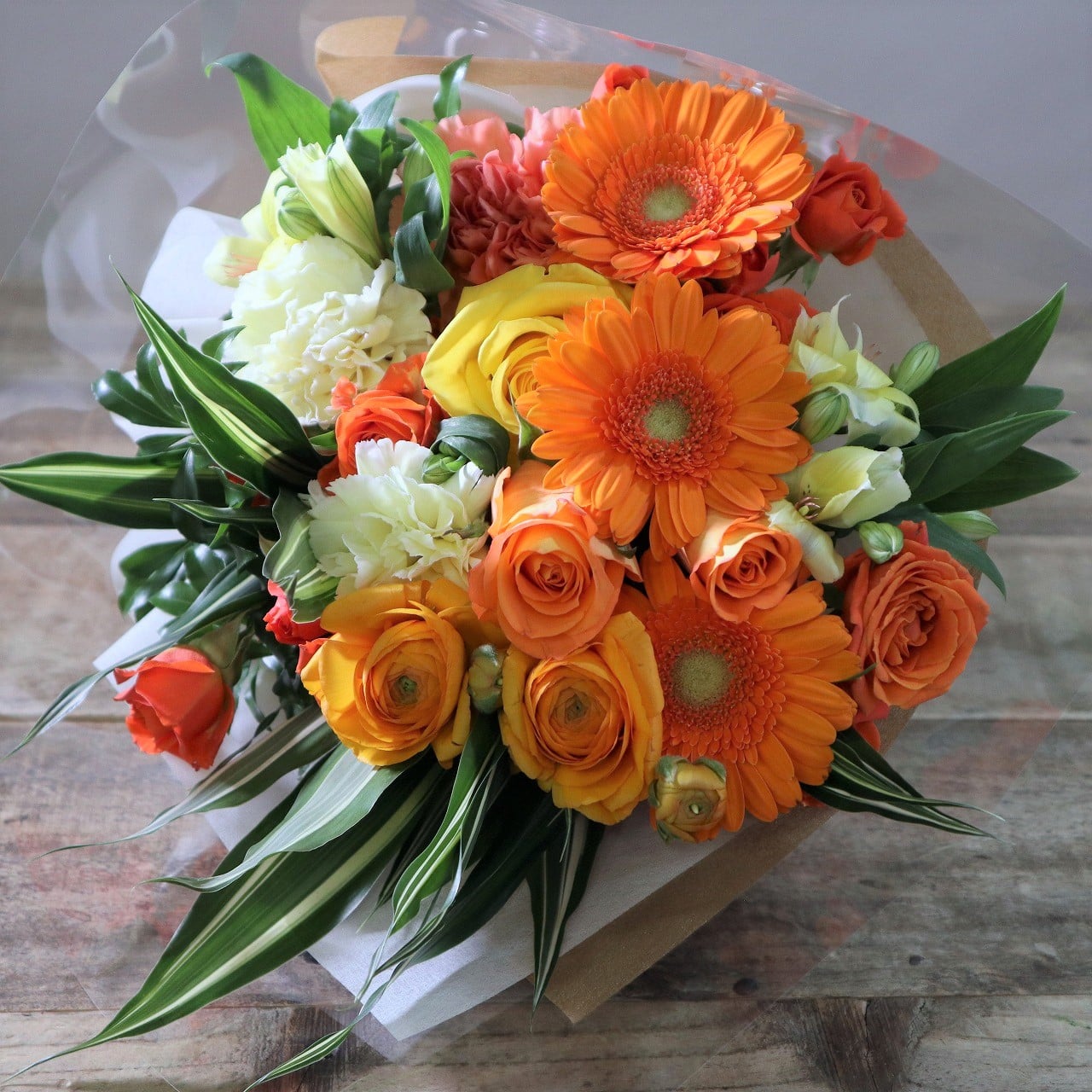 お花の力で、気分が明るくなっていただけたら嬉しいと思い、オレンジ、黄色の明るい色のおまかせの花束をお願いしました。