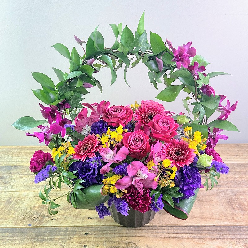 ご感想: 男性へのお祝いでしたので、かわいらしくなり過ぎないようこちらからいろいろとリクエスト致しましたが、高級感のある素敵なお花になり大変満足しています。