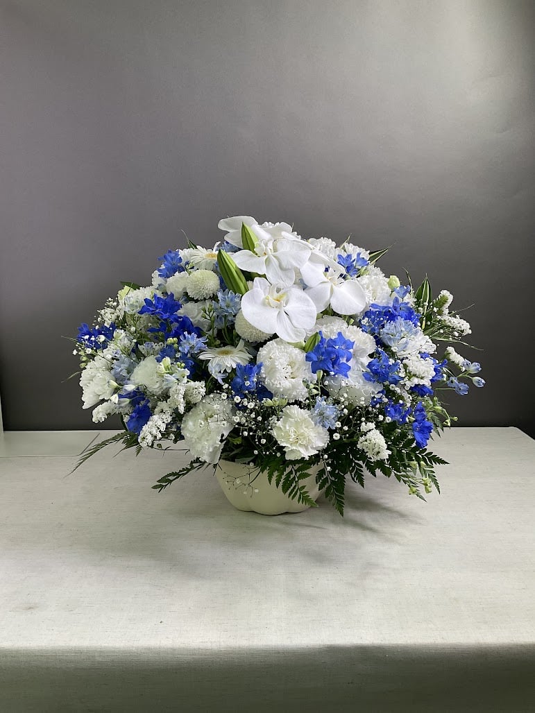 父の好きな鮮やかなインディゴの色を添えた美しいアレンジメントが届き、母も大変喜んでおります。