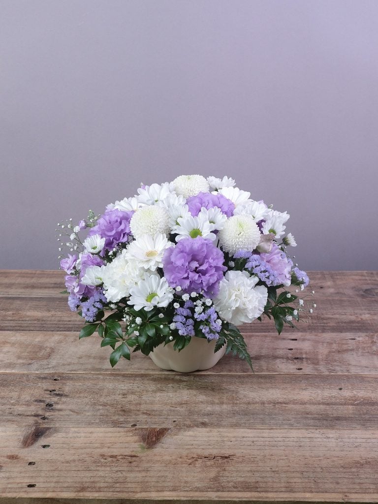 ご感想:故人は自分にとって心の距離の近い友人でした。届けたいのは心からの気持ちで、きれいに丁寧に作っていただいて嬉しく思います。画像を見て涙が出ました。柔らかく品のある方だったので、紫のお花がイメージ通りです。彼女に会いたくなったら、お花の画像を見て心の対話をしたいと思います。ありがとうございました。